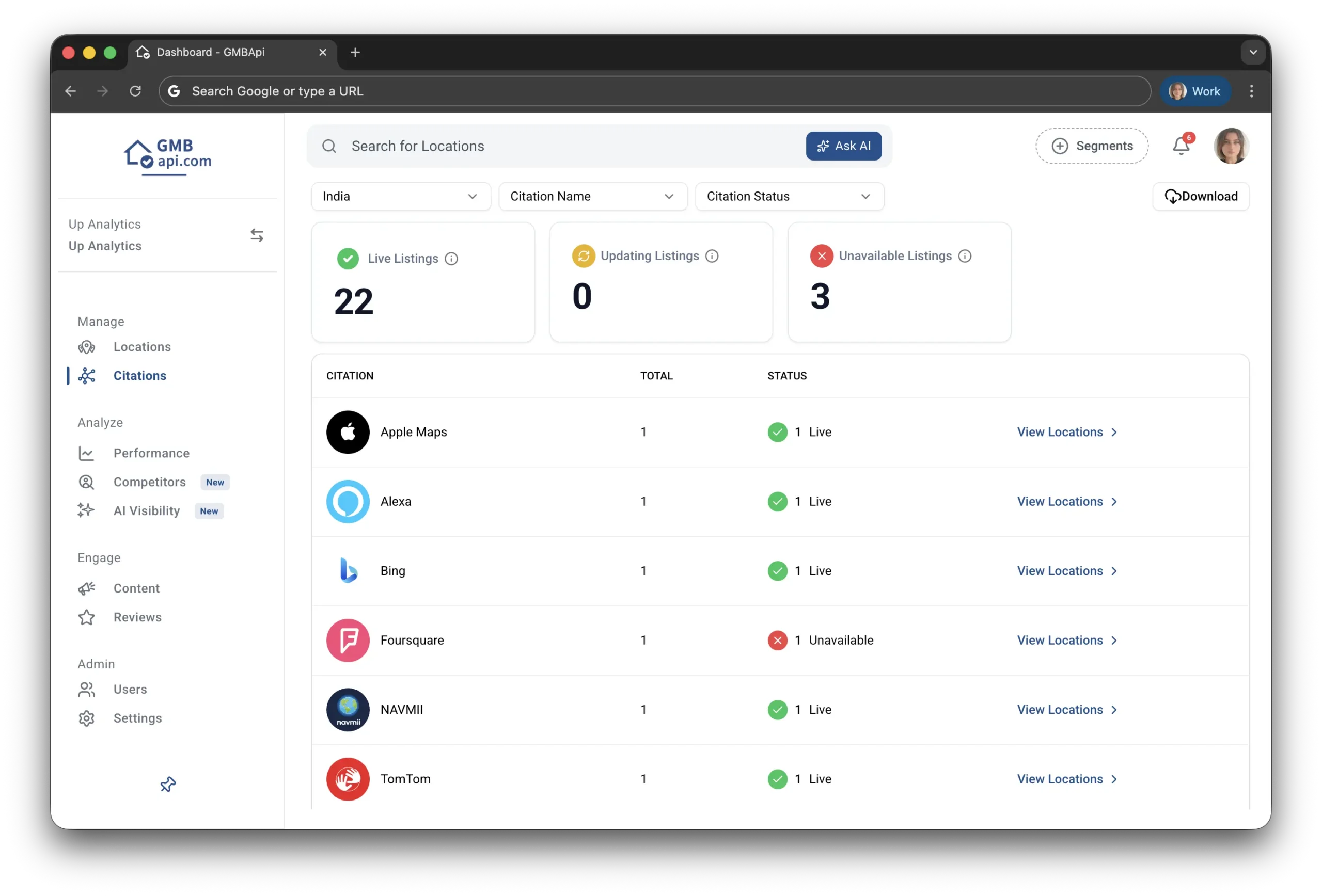 Contrairement à d'autres outils, GMBapi.com Citations s'appuie sur les fiches d'établissement Google en tant que plaque tournante, synchronisant vos informations avec des dizaines d'annuaires pertinents, d'applications de navigation et de plates-formes sectorielles.