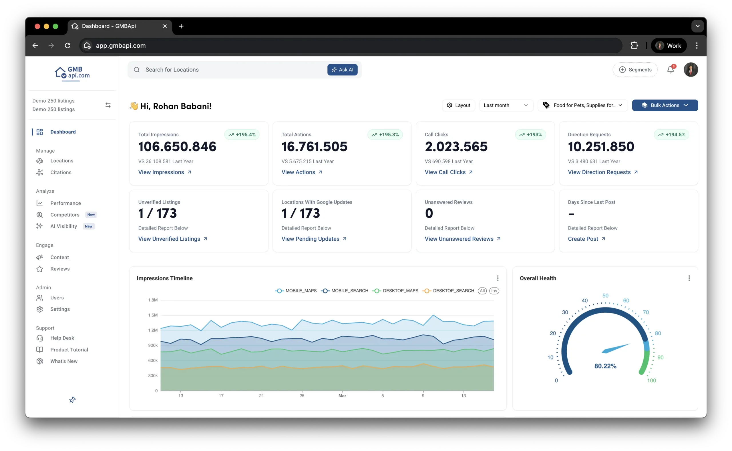 Pantau performa local search dan temukan apa yang mendorong visibilitas di semua lokasi Anda dari satu dashboard yang intuitif. Pastikan listing Anda memenuhi standar kualitas data Google dan lebih unggul dari kompetitor. Semakin akurat data, semakin tinggi visibilitas. Lacak metrik penting, interaksi pelanggan, dan kata kunci pencarian.