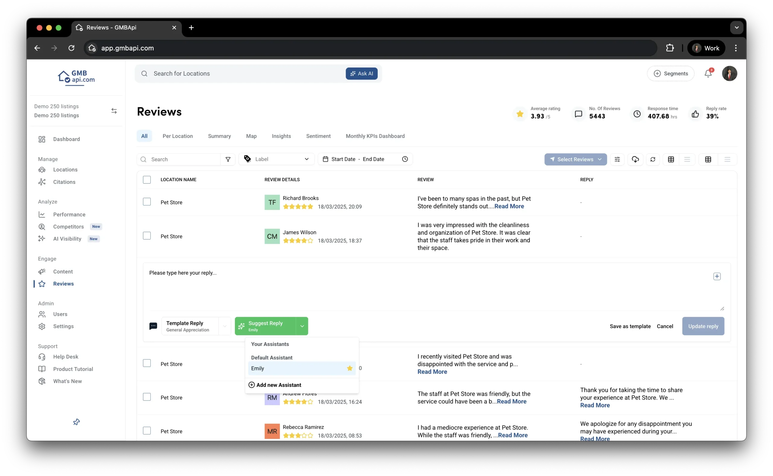 Setidaknya 82% konsumen membaca review sebelum memutuskan untuk membeli. GMBapi.com mempermudah strategi review dengan balasan AI yang bisa disesuaikan dengan gaya bahasa brand Anda. Analisis sentimen serta laporan per lokasi membantu Anda merespon feedback dengan cepat dan akhirnya meningkatkan kepercayaan terhadap produk Anda.