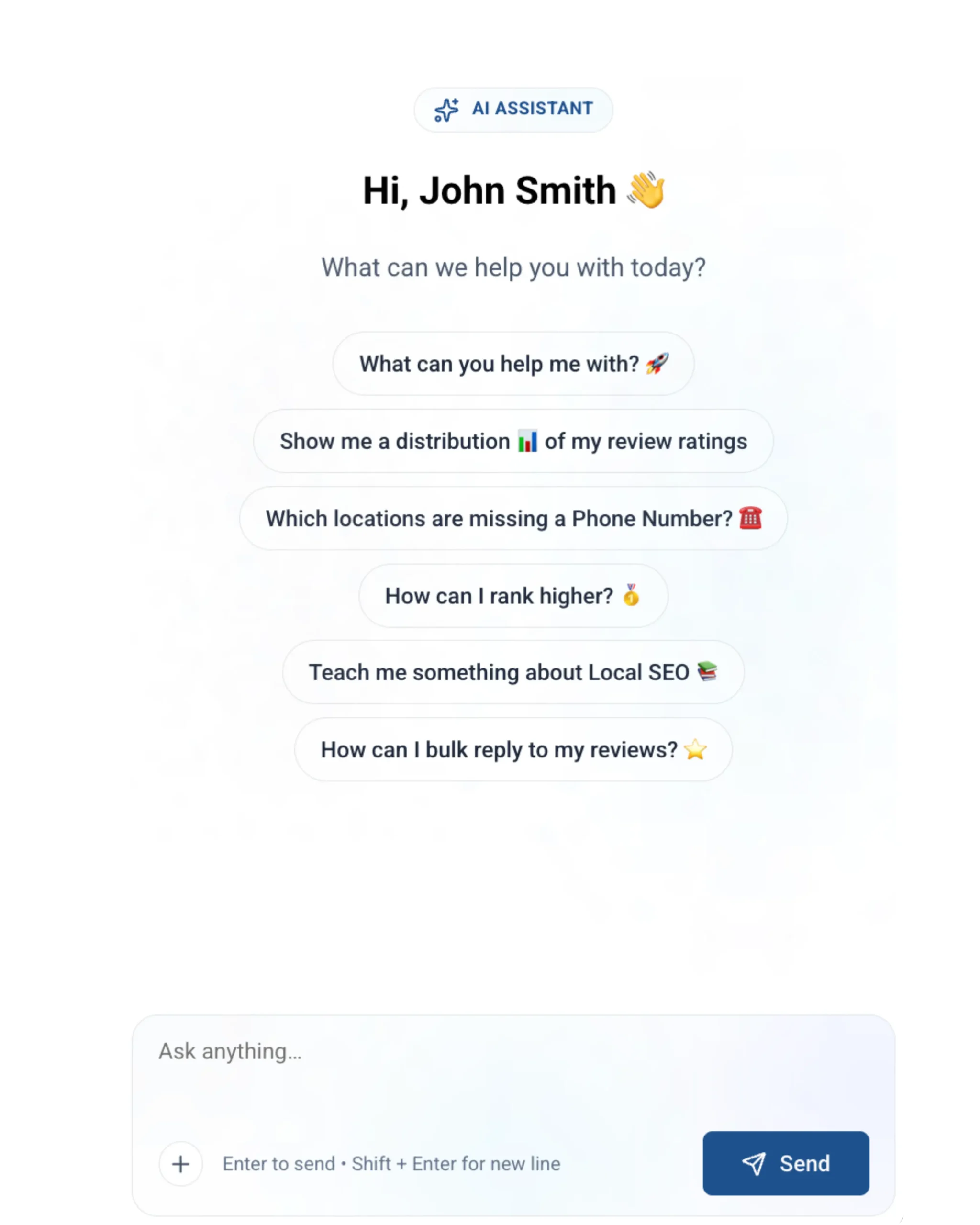 Con il nostro agente intelligente di intelligenza artificiale, potrete ottenere una guida Local SEO di livello esperto in pochi secondi. Addestrato su un'ampia gamma di dati in GBP, vi aiuta a ottimizzare i vostri post, le vostre foto e le vostre inserzioni di servizio con sicurezza. Che si tratti di decidere quali contenuti pubblicare, di affinare le descrizioni dei servizi o di pianificare una strategia di pubblicazione in più sedi, l'agente IA fornisce informazioni immediate per aiutarvi a creare, gestire e distribuire contenuti di grande impatto.