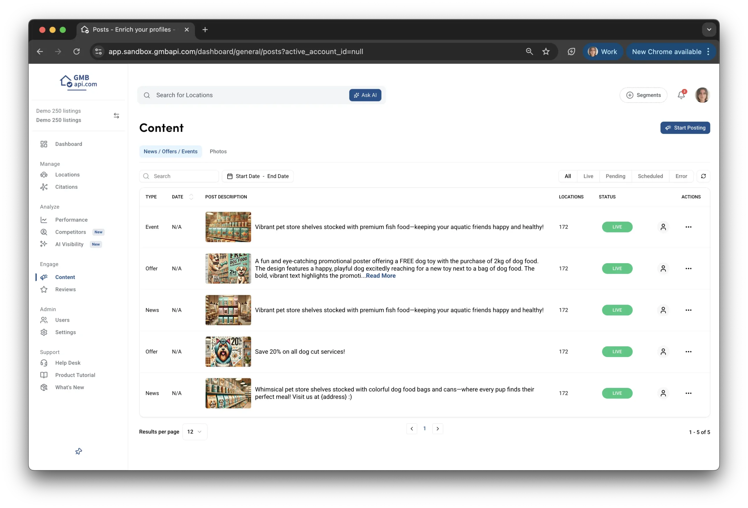 Con GMBapi.com potete portare la vostra strategia di pubblicazione a un livello superiore. I nostri strumenti basati sull'intelligenza artificiale vi aiutano ad automatizzare la creazione di contenuti, a gestire i post di tutte le vostre sedi da un'unica piattaforma centrale e a ottenere risultati migliori dove conta: su Google. Provatelo gratuitamente per 14 giorni e scoprite come un approccio più intelligente e scalabile ai contenuti possa migliorare le vostre classifiche locali.