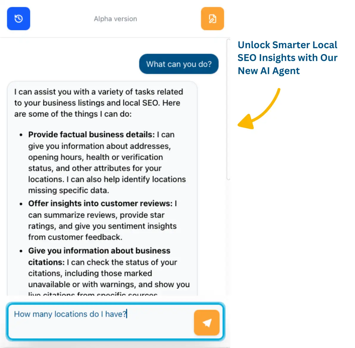 Meet your new local SEO assistant! Our powerful, chat-based AI agent. Trained on real local SEO data and platform documentation, the AI assistant can: